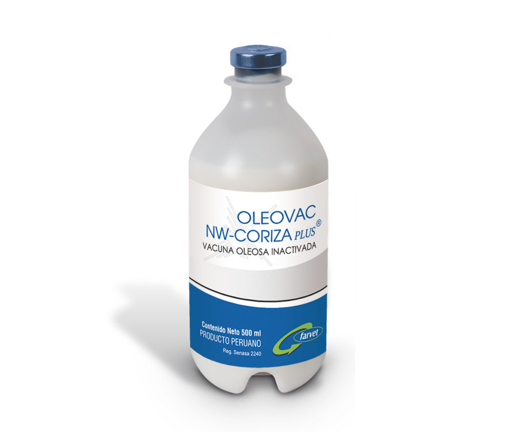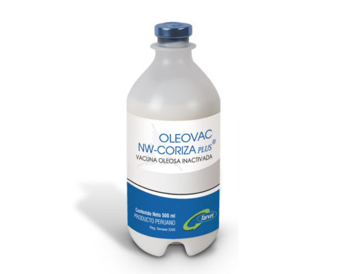 OLEOVAC NW-CORIZA PLUS® contains an inactivated combination of the LaSota strain of Newcastle disease virus (NDV) and serotypes A, B and C of the culture of Avibacterium paragallinarum, homogenized with an oily adjuvant. The vaccine contains for every 1.0 ml: ≥4×108.0 TCID50% of NDV and ≥4×108.0 UFC of Avibacterium paragallinarum.